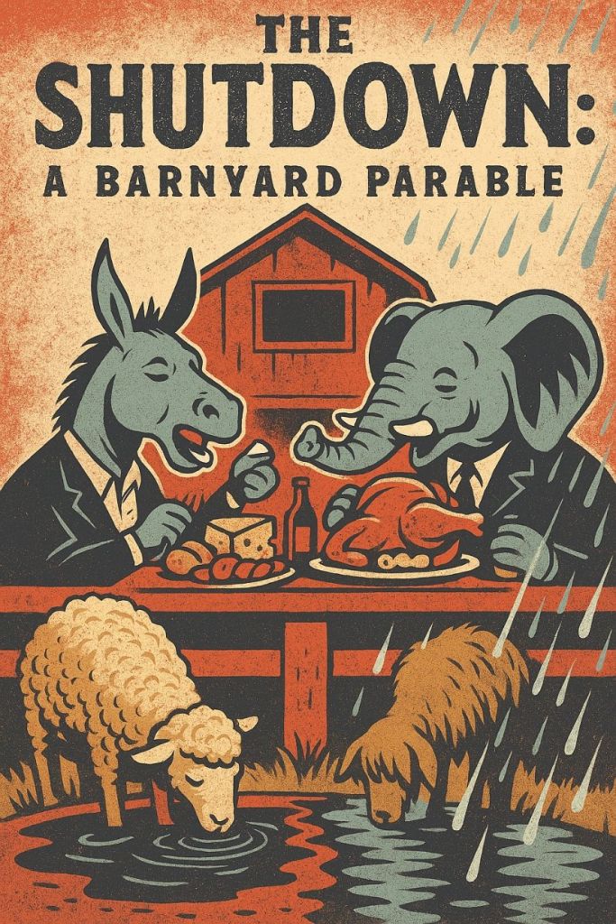 The Elephants and Donkeys panic. They can’t shut down rain. They try: “Unauthorized water collection is dangerous! Only properly filtered water protects you!” But more animals notice—every time it rains, the Big House residents rush to cover their feast tables while the rest of creation drinks freely.