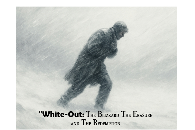 The storm that day covered the world in white‑out. It was the kind that erases roads, landmarks, and every trace of what came before. This white‑out was more than a blizzard’s veil. It symbolized life itself in a double-edged manner. It presented a world erased yet also a canvas for renewal.